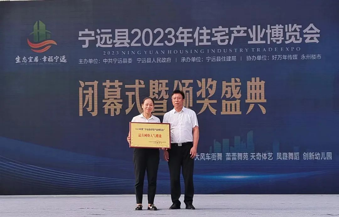 经过5天的网络投票,首府壹号斩获2023年度“宁远县住宅产业博览会”最具网络人气楼盘颁大奖。