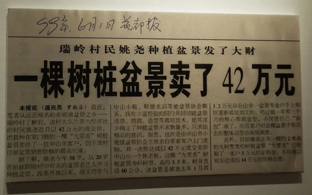 In May 1999, villager Yao Yao cultivated a nine mile fragrant bonsai and sold it to a customer in Zhongshan City for 420000 yuan, setting a record for the highest selling price of a single bonsai in the village's "hometown of bonsai" at that time.