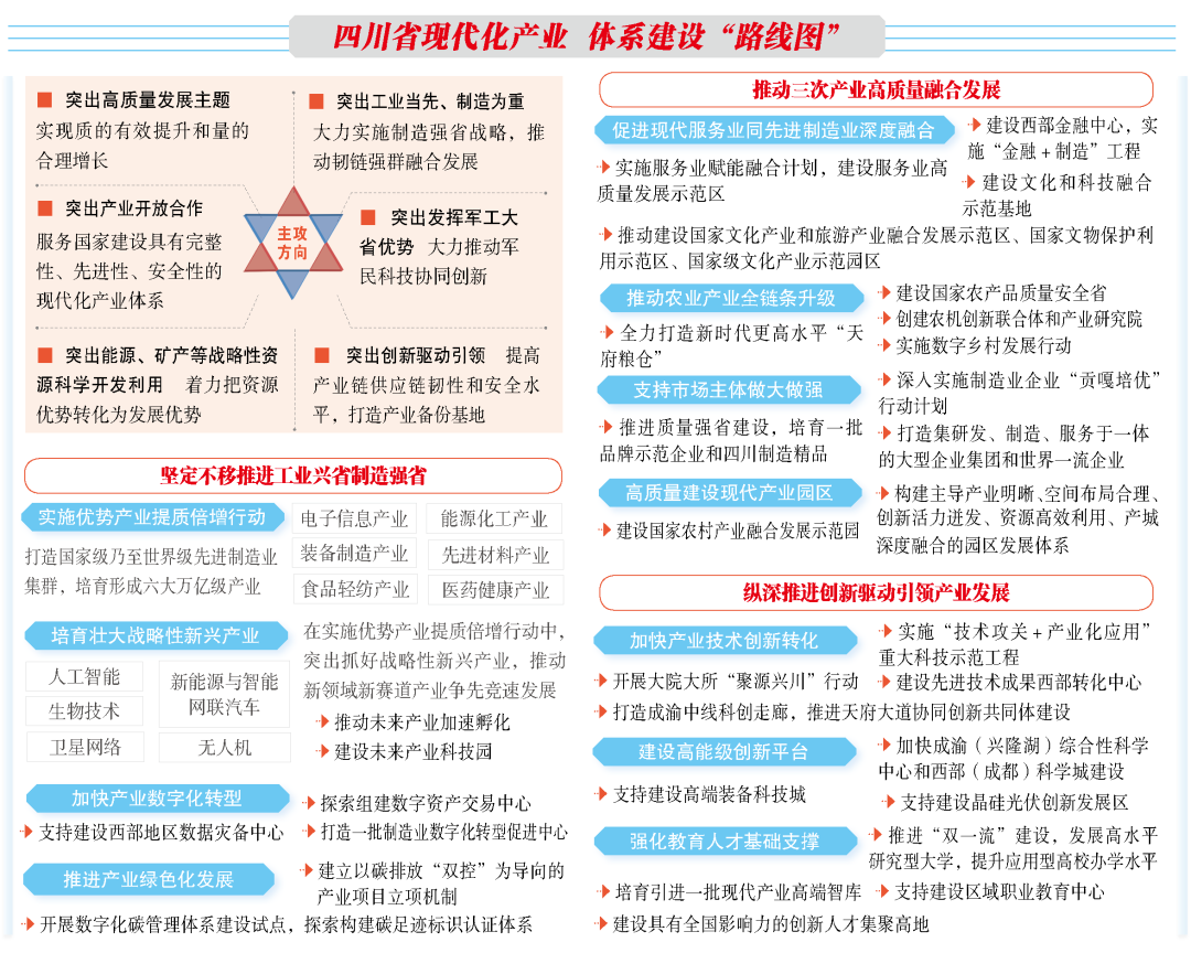 6月19日,中共四川省委十二届三次全会召开,审议通过《中共四川省委关于深入推进新型工业化加快建设现代化产业体系的决定》,突出工业当先、制造为重,提出“扬优势、锻长板,促创新、增动能,建集群、强主体”的工作思路,构建以实体经济为支撑的现代化产业体系,加快向现代化经济强省全面跃升。围绕落实省委决定,成都、绵阳、攀枝花市委全会聚焦现代化产业体系建设,对加快新型工业化等进一步作出部署,汇聚起工业扛大旗挑大梁的澎湃力量。