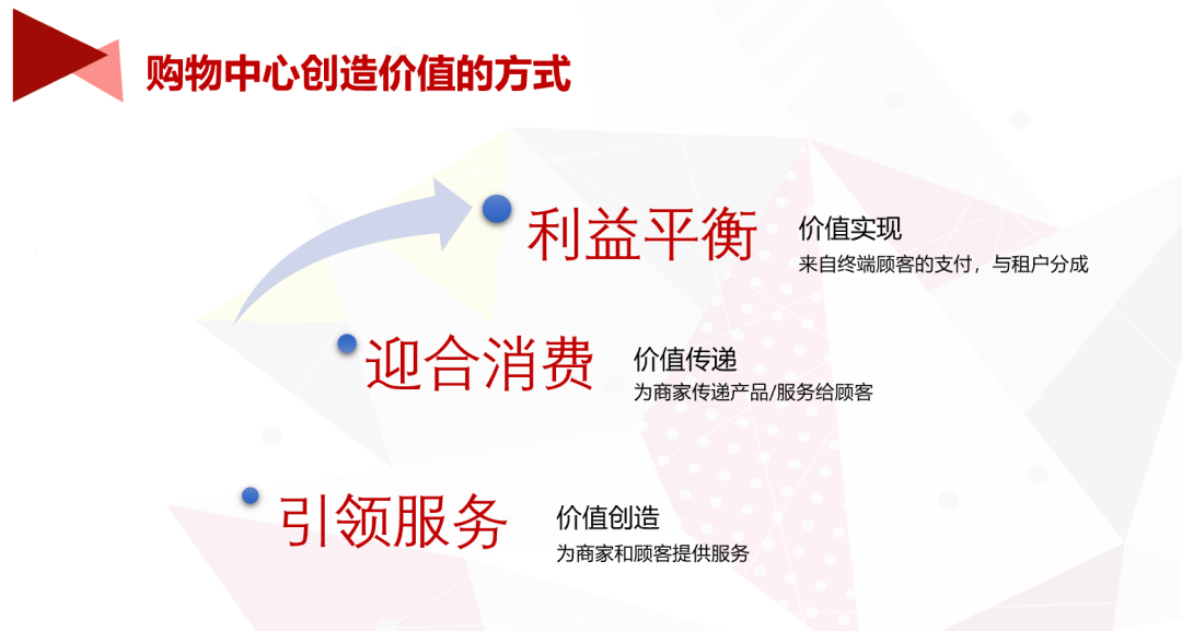 3.1 价值创造:即为商家和顾客提供服务。这是平台模式的基础功能。服务创造价值,购物中心管理者应进行市场调查和分析,了解主要商家和主顾客群的服务期望,制定领先于市场的服务标准和措施。在服务提供的过程中,对商家和顾客的服务期望与服务标准、服务标准与服务提供、服务提供与服务感知的差距进行分析,并不断修正。3.2 价值传递:即为商家传递产品/服务给顾客。这是平台模式的重要功能。消费需求的多元化和商品品类的多样性,给购物中心的发展带来了机会,也带来了选择的困难。分析主顾客群和潜在顾客群的消费需求,迎合消费需求,进行购物中心的功能规划、品类规划、业态规划和租户组合,将更有利于为商家传递产品/服务给顾客。3.3 价值实现:即来自终端顾客的支付,与租户分成。监管和平衡消费者、商家与购物中心三方的利益,构建和谐的生态环境。监管商家产品的质量和价格,保证顾客的权益,培养顾客的忠诚度;协助商家促进销售,平衡购物中心与商家的收益,项目得以可持续向上发展。购物中心作为生活方式体验中心,里面的内容和载体大部分是零售业态。零售业态一直在变,但决定零售行业变化的本质一直没变:成本、效率和体验。购物中心作为一个交易平台,连接了消费者和商家,是双方交易的渠道。其价值来自于减少消费者和商家的交易成本,更高效地满足双方的需求。合理的空间设计,同时满足了降低商家和顾客成本,提高交易效率,更加注重体验,需要比过去更加重视。从“平台交易”到“生活方式体验中心”,对购物中心主题、区域功能的选择更加重要;不断更新生活方式、时尚资讯,不断为品牌形象、消费文化赋能,使购物中心保有活力。引领服务以创造价值、迎合消费以价值传递、利益平衡以价值实现,构建和谐的生态环境。这些将是购物中心可持续发展的基础。