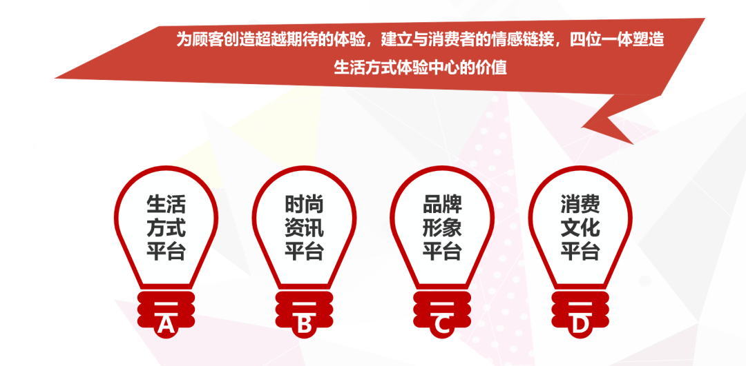 购物中心已经从购买功能过渡为融入到目标消费群的生活,成为生活场景,提供社交、聚会、娱乐、休闲等多维度的复合需求。我们要跟商家共同努力,在公共空间、商业空间、主题活动空间、店铺,不停创造更多的生活场景。提供我们购物中心的社交资本。对于当前和未来实体商业,谁能提供最强大的社交资本,就可以获得大量年轻人关注,也能帮助商家引流,产生大量的消费潜在意识,从而促进销售。时尚将不仅是时尚商品,而是以商品为纽带,形成一个有故事、有人格、有温度、以及有参与感的社交游戏。引进有传播力网红店、首进品牌,将会传播时尚资讯,给购物中心带来流量;以消费者的痛点、甜点、痒点、情感需求为出发点,提供生活方式解决方案,给购物中心带来流量。场所会对购物中心所售卖的商品和所有消费行为赋上颜色,场所是一个染色的过程,所有的品牌、所有的行为,都会被染色。同样品牌的衣服,在不同的商场,给顾客带来不同的价值感;顾客在有品质的购物中心消费,将会被贴上自信、成功的标签。今天的消费者,是用场景的趣向,表达自己。在什么地方吃饭,在什么地方买什么样的商品,对自己进行一个标注。分析不同的社群文化,思考我们和不同的社群是一种什么关系,才有可能建立起商品与社群、社群与社群之间的连接,才会有大规模的客户产生消费。购物中心作为“生活方式体验中心”的平台,也吻合基于价值创造、价值传递和价值实现的商业逻辑。