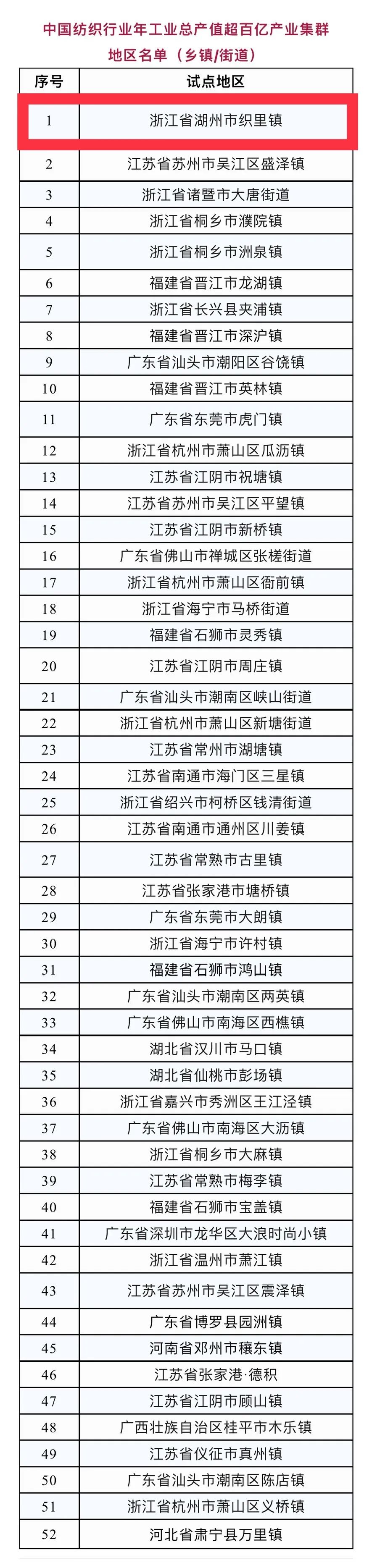 日前,中国纺织工业联合会发布当前重点纺织产业集群地区的建设成果,吴兴区织里镇位居榜首!