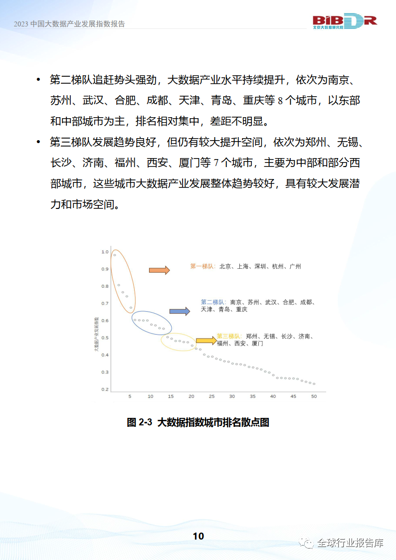 •第一梯队绝对优势明显,引领全国大数据产业发展,依次为北京、上海、深圳、杭州、广州等5个城市,主要集中在东部沿海。这些城市实力雄厚,大数据产业发展水平处于全国领先地位。