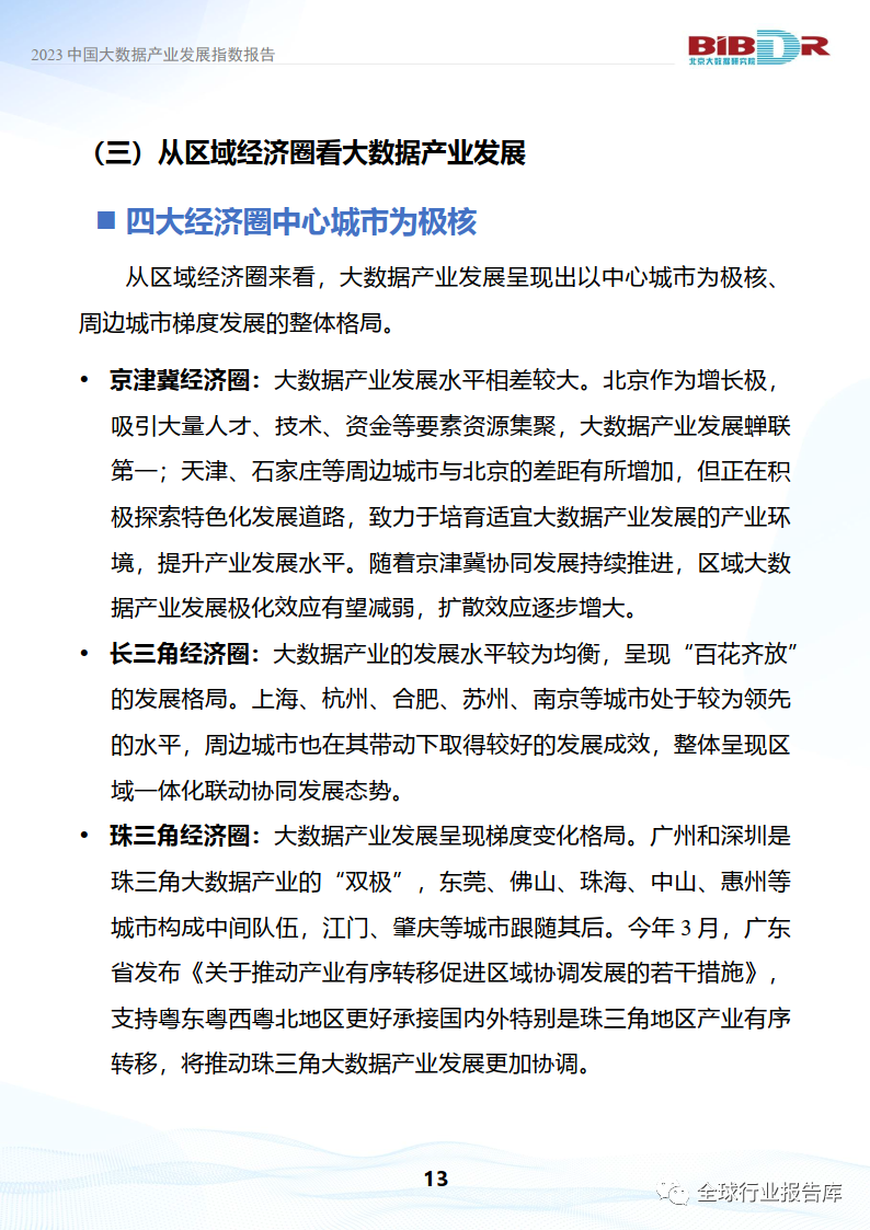 •长三角经济圈:大数据产业的发展水平较为均衡,呈现“百花齐放”的发展格局。上海、杭州、合肥、苏州、南京等城市处于较为领先的水平,周边城市也在其带动下取得较好的发展成效,整体呈现区域一体化联动协同发展态势。Ÿ珠三角经济圈:大数据产业发展呈现梯度变化格局。广州和深圳是珠三角大数据产业的“双极”,东莞、佛山、珠海、中山、惠州等城市构成中间队伍,江门、肇庆等城市跟随其后。今年3月,广东省发布《关于推动产业有序转移促进区域协调发展的若干措施》,支持粤东粤西粤北地区更好承接国内外特别是珠三角地区产业有序转移,将推动珠三角大数据产业发展更加协调。