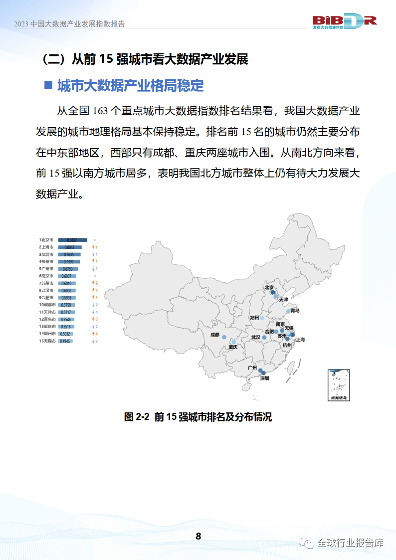 •从全国163个重点城市大数据指数排名结果看,我国大数据产业发展的城市地理格局基本保持稳定。排名前15名的城市仍然主要分布在中东部地区,西部只有成都、重庆两座城市入围。从南北方向来看,前15强以南方城市居多,表明我国北方城市整体上仍有待大力发展大数据产业。