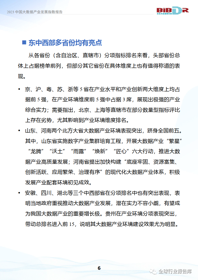 •安徽、四川、湖北等三个中西部省在分项排名中也有突出表现,表明当地政府重视推动大数据产业发展,潜在实力不容小觑,有望成为我国大数据产业的重要增长极。贵州在产业环境分项表现突出,带动总排名进入前15,说明其大数据产业环境建设效果尤为明显。