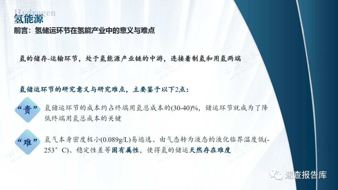氢的储存-运输环节,处于氢能源产业链的中游,连接着制氢和用氢两端;氢储运环节的研究意义与研究难点,主要鉴于以下2点: