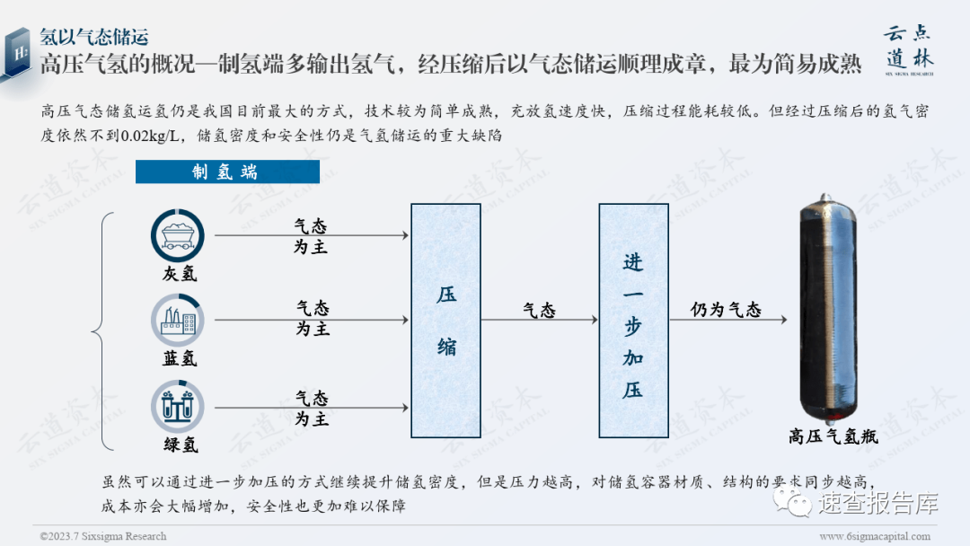 “难”:氢气本身密度极小(0.089g/L)易逃逸、由气态转为液态的液化临界温度低(-253°C)、稳定性差等固有属性,使得氢的储运天然存在难度。