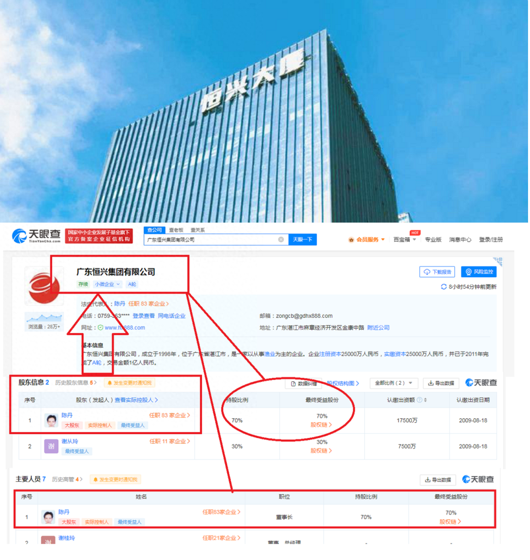 根据天眼查最新数据,陈丹直接持有广东恒兴集团有限公司70%股份,是该企业控股股东、实际控制人,拥有绝对控股权,同时他也是该企业的董事长、法定代表人。