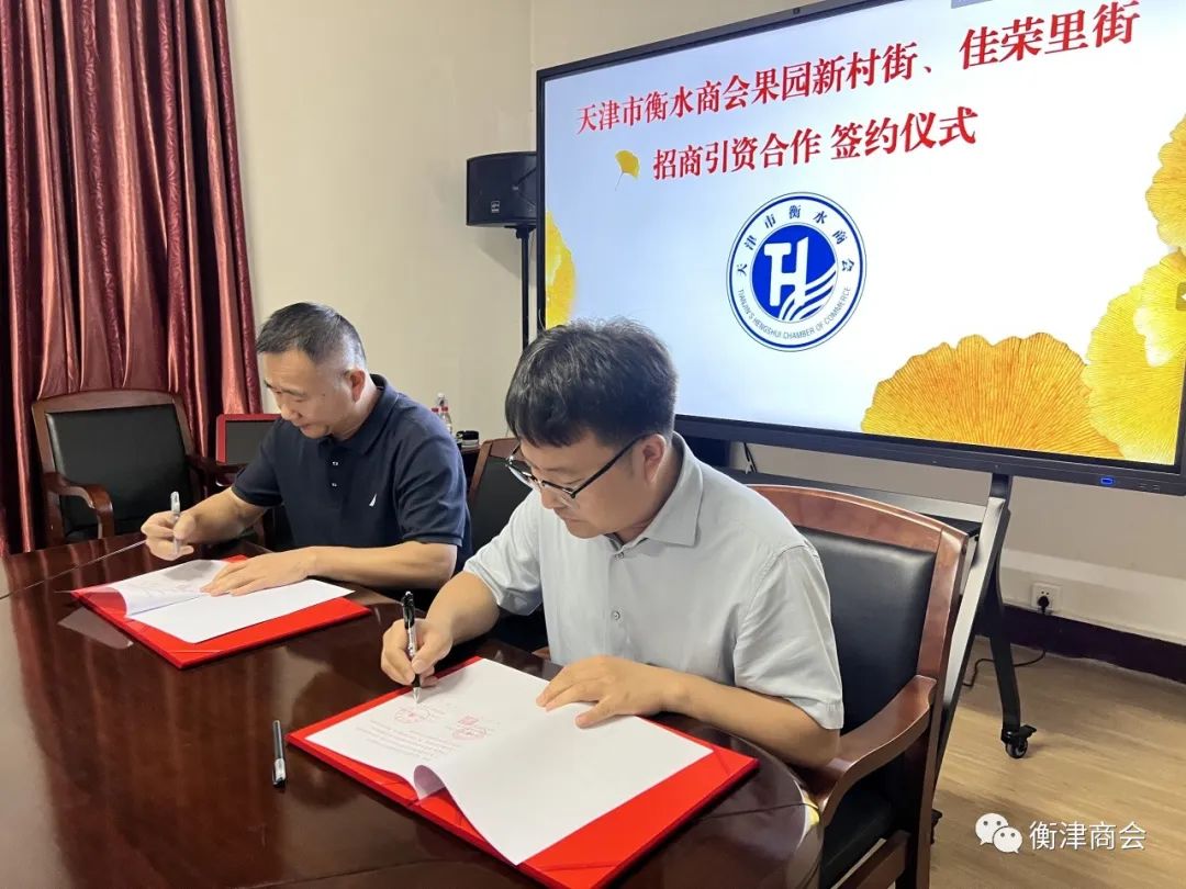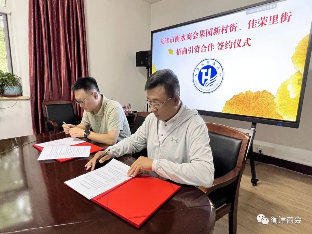座谈会上,冯泽会长、刘涛副会长代表商会,孟祥华主任、杜建义调研员分别代表果园新村街及佳荣里街共同签订招商引资合作框架协议。