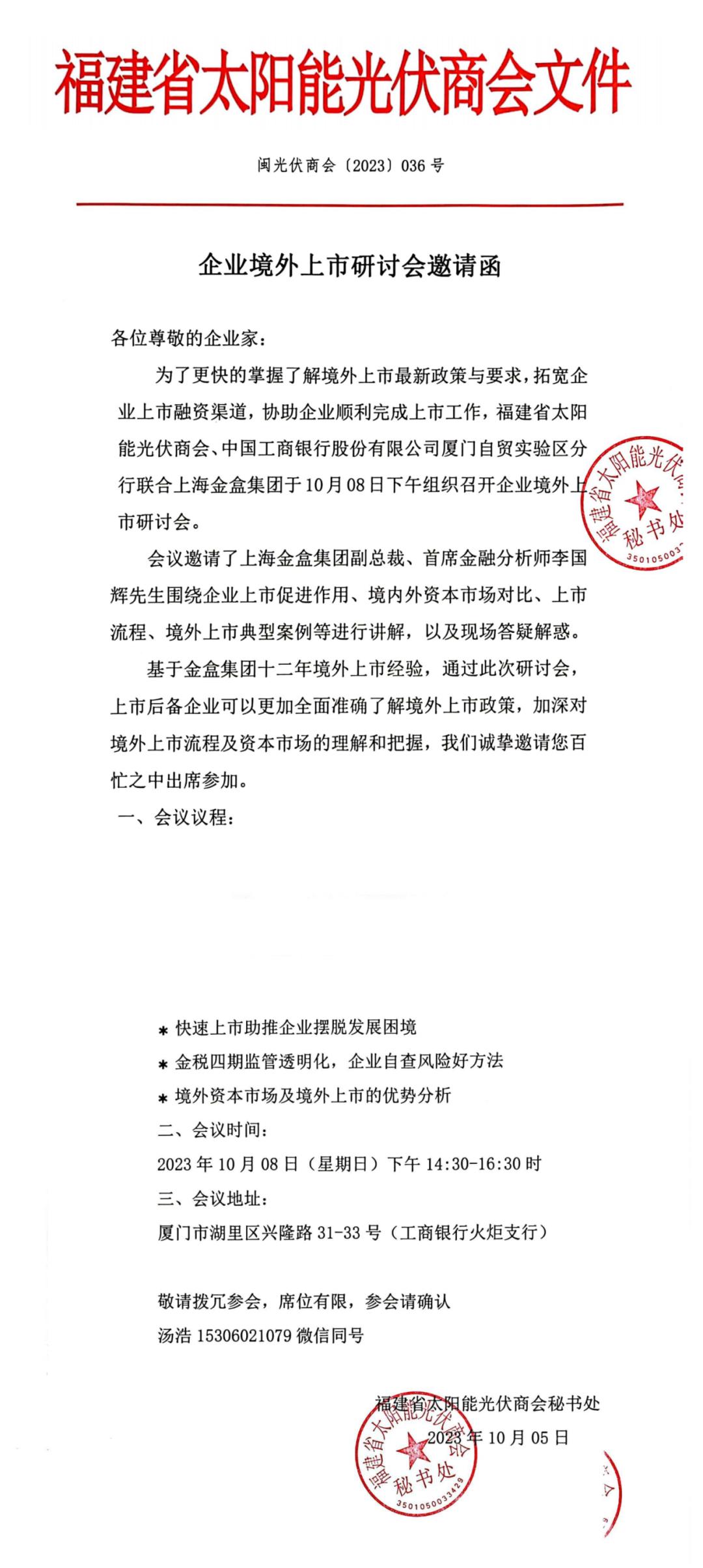 商会通告 | 福建省太阳能光伏商会企业境外上市研讨会邀请函