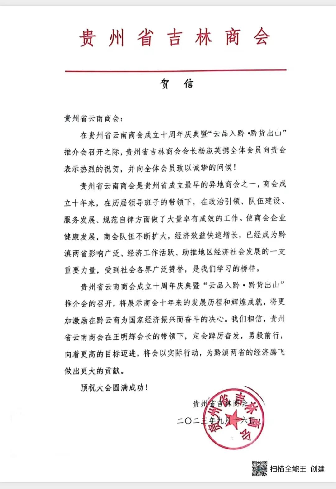 程立新书记代表商会参加贵州省云南商会成立十周年庆典,贵州省吉林商会发去了贺信!