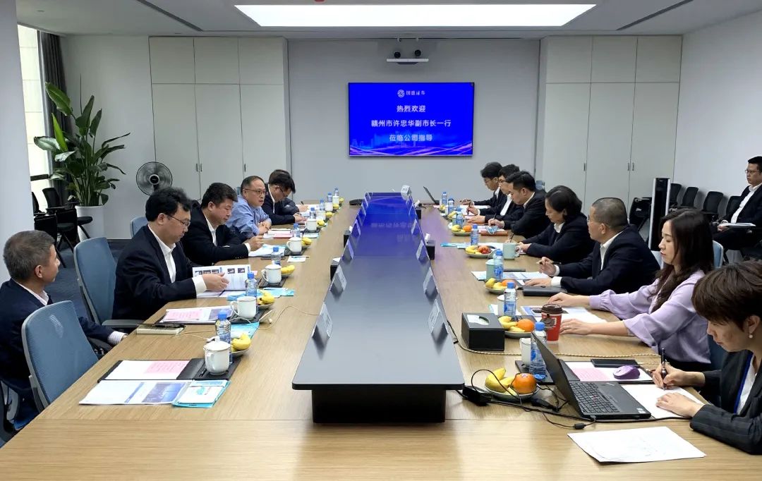 在国盛证券上海总部,考察组一行与国盛证券总裁徐丽峰等进行了座谈交流。国盛证券全面介绍了该司研究所、债券部、投行部的有关情况,汇报了“一司一县”对口支援的成效进展,对赣州支持国盛证券投教基地建设表示感谢。