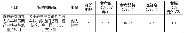 二、竞租人资格。中华人民共和国境内法人、自然人和其他组织诚实守信、无不良记录者均可申请参加竞租,但法律法规另有规定的除外。三、竞租登记。竞租人可于2023年10月7日后登录淮南市公共资源交易中心网(网址:http://jy.ggj.huainan.gov.cn/)自行下载寿县寿春镇九龙汽车城四期产业扶贫基地租赁项目挂牌文件。并于2023年10月17日15时00分至15时30分(其他时间不接受竞租登记)携相关资料(单位竞租须提供营业执照、法人委托书和委托代理人有效身份证、竞租保证金票据;自然人竞租须提供有效身份证和竞租保证金票据)到寿县寿州公共资源交易有限公司业务三部办理竞租登记。交纳竞租保证金的截止时间为2023年10月17日下午15时00分。(一)挂牌时间:2023年10月17日15时30分(二)挂牌地点:寿县公共资源交易服务中心开标一室(寿县城投大厦5楼)(二)成交确认书发出后10日内签订合同,租金应按合同要求付至产权单位指定帐户。(三)标的物勘察时间自公告之日起至挂牌截止时间前一天(工作时间内),意向竞租人应自行踏勘现场,凡参加竞租登记的各意向竞租人都视同已实地踏勘和确认了标的面积、使用情况及相关法律法规政策等,对标的存在的瑕疵、及可能存在的瑕疵应有充分的认识,竞租成功后,不得以不完全了解标的的详情为由提出疑义(包含但不限于水、电、路等硬件设施及周边邻里情况须竞得人自行解决),委托人(挂牌单位)及代理机构不承担任何责任。(四)本次租赁项目不设底价,按照价高者得的原则确定竞得人,最终报价必须超过或等于参考价,否则不成交。六、保证金缴纳。本次挂牌竞租保证金通过转账汇入寿县寿州公共资源交易有限公司的下列任一银行帐户(单位竞租的需从竞租单位银行账户将竞租保证金汇入寿县寿州公共资源交易有限公司的下列任一银行帐户),不接受现金缴款(在汇入保证金时应注明项目名称或项目编号和标段号)。