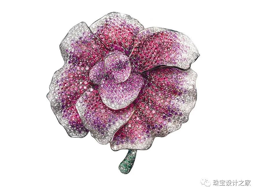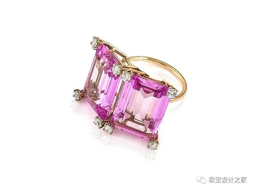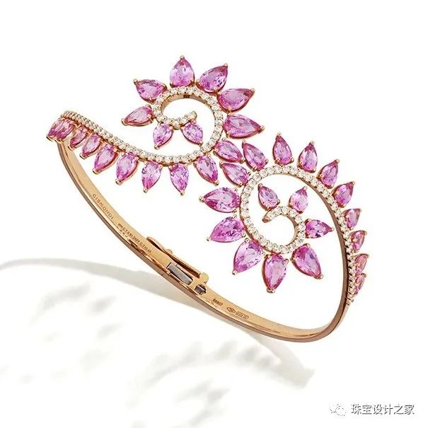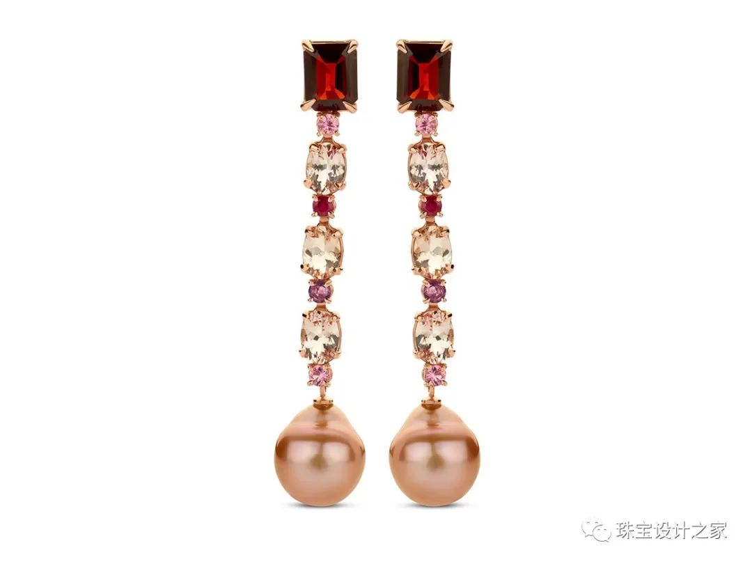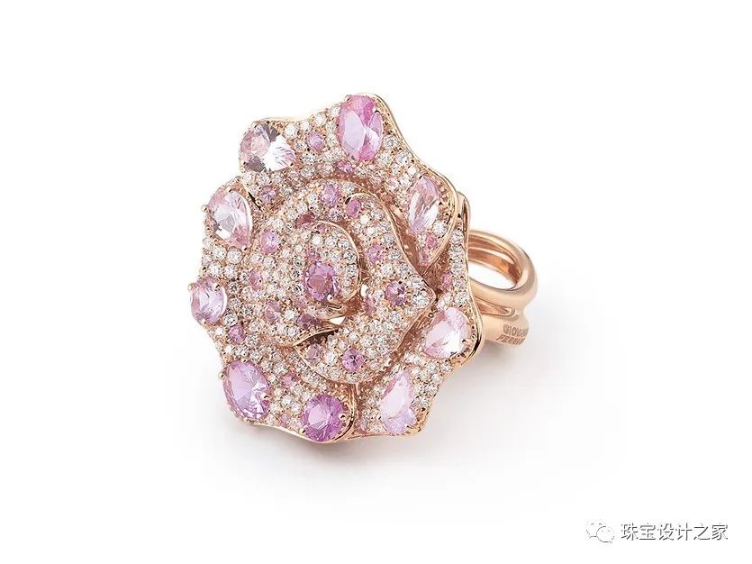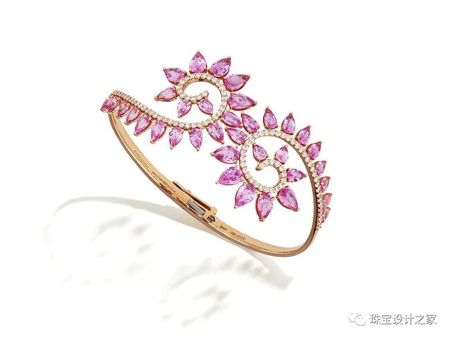 镶嵌石榴石、摩根石、粉色蓝宝石、红宝石、紫水晶和粉色珍珠。