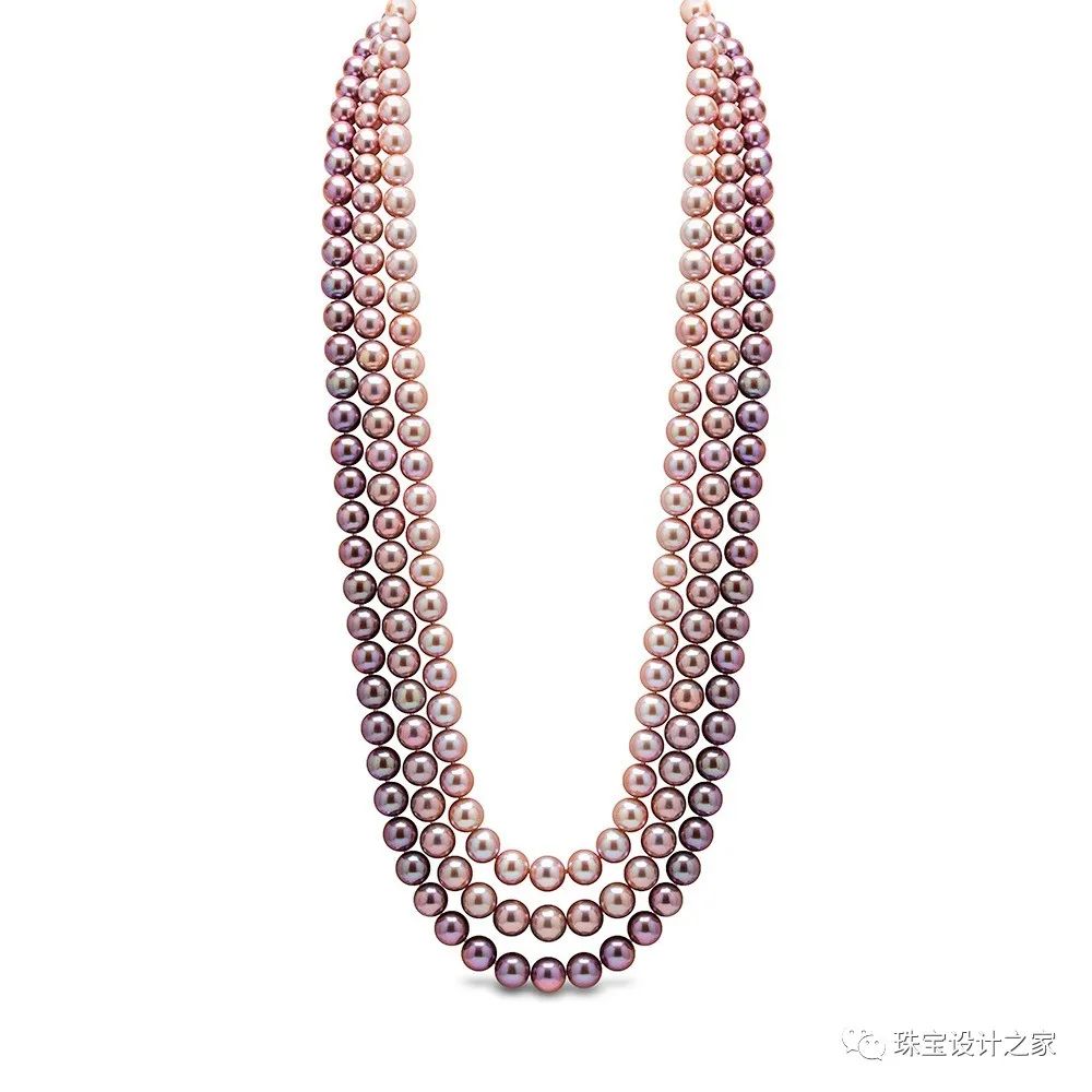 最优雅的是日本珠宝商 Yoko London 制作的一件珍珠项链,透出淡雅的粉紫色调光晕——项链由莹润的淡水珍珠串成3圈结构,直径约为9.8mm至11.8mm。最外圈的珍珠呈深紫色虹彩,中央一圈珍珠具有淡雅的粉色和褐色光泽,最内圈珍珠流露出温婉的米白色调,营造出柔美的渐变色泽。