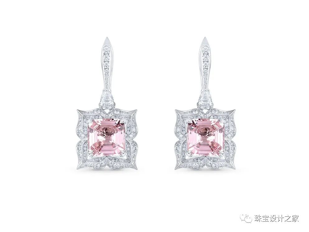 主石为2颗总重2.12ct水滴形切割摩根石,镶嵌14颗总重2.37ct圆形切割粉色蓝宝石,镶嵌45颗圆形明亮式切割钻石。