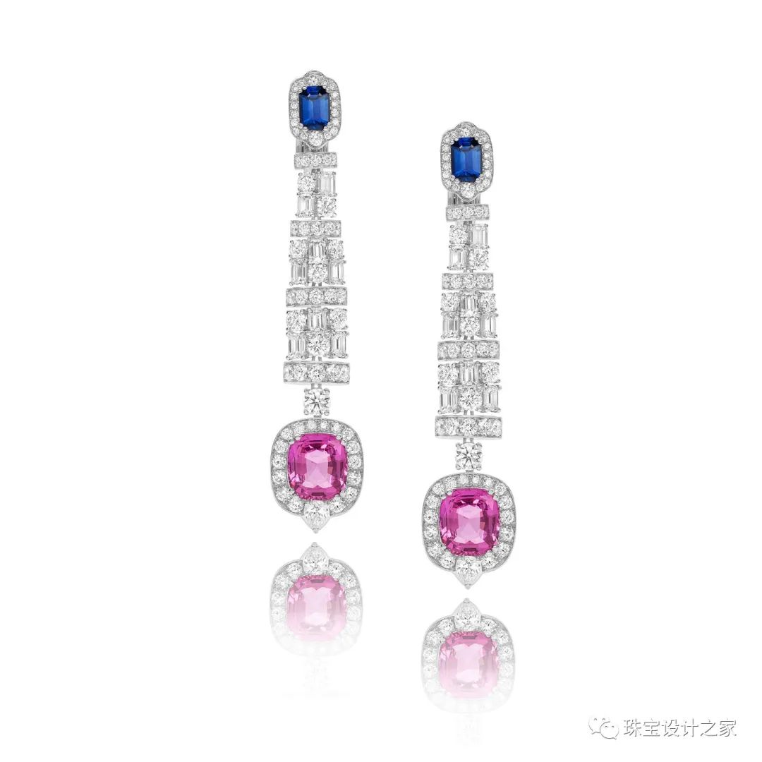镶嵌2颗总重7.39ct粉色蓝宝石,2颗总重1.43ct蓝宝石,以及7.65ct阶梯型和圆形切割钻石。