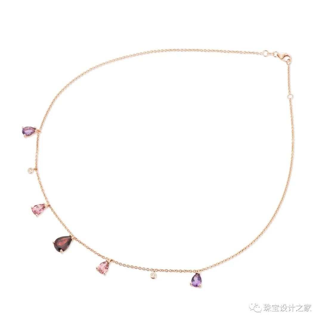 镶嵌水滴形切割紫水晶、粉碧玺和石榴石,点缀圆形钻石。