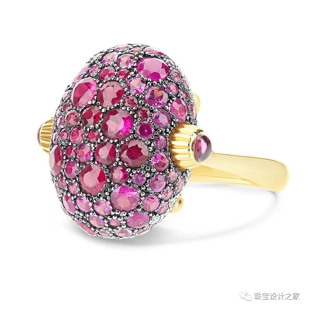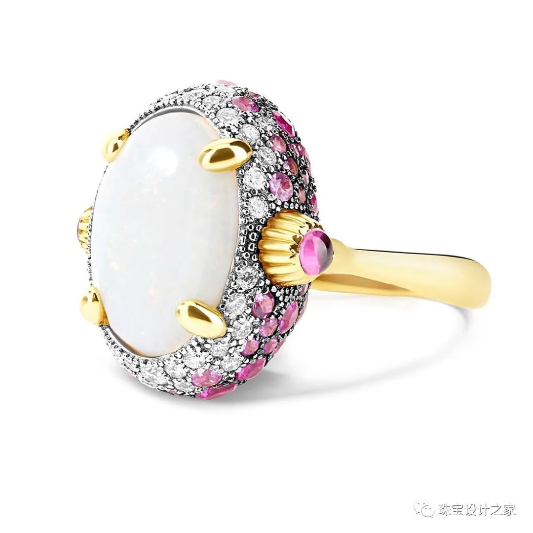 最具匠心的是意大利珠宝商 Nanis 制作的一枚 Reverse 黄金戒指,戒面采用可翻转设计——一面是一颗5.75ct弧面切割澳大利亚白欧泊,具有透明而朦胧的天然变彩,在圆钻衬托下更显梦幻;另一面戒面密镶红宝石、粉色和紫色蓝宝石,营造出甜美浪漫的视觉效果。