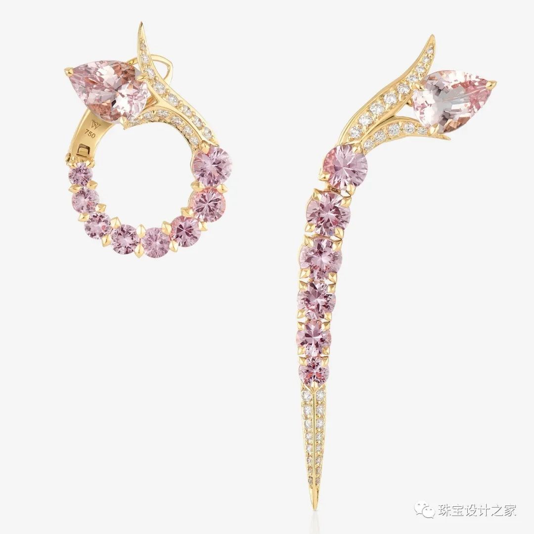 粉色珠宝展品中最引人注意的是一对 Thorn Embrace Unfurled 荆棘主题黄金耳环,由英国设计师 Stephen Webster 设计——黄金荆棘枝镶嵌大小渐次的粉色蓝宝石,托起2颗总重2.12ct的水滴形摩根石主石营造出瑰丽光芒,寓意甜蜜与痛苦并存。亮点是耳环采用不对称设计,一侧为荆棘环绕,另一侧自然垂落,让作品更具张力。