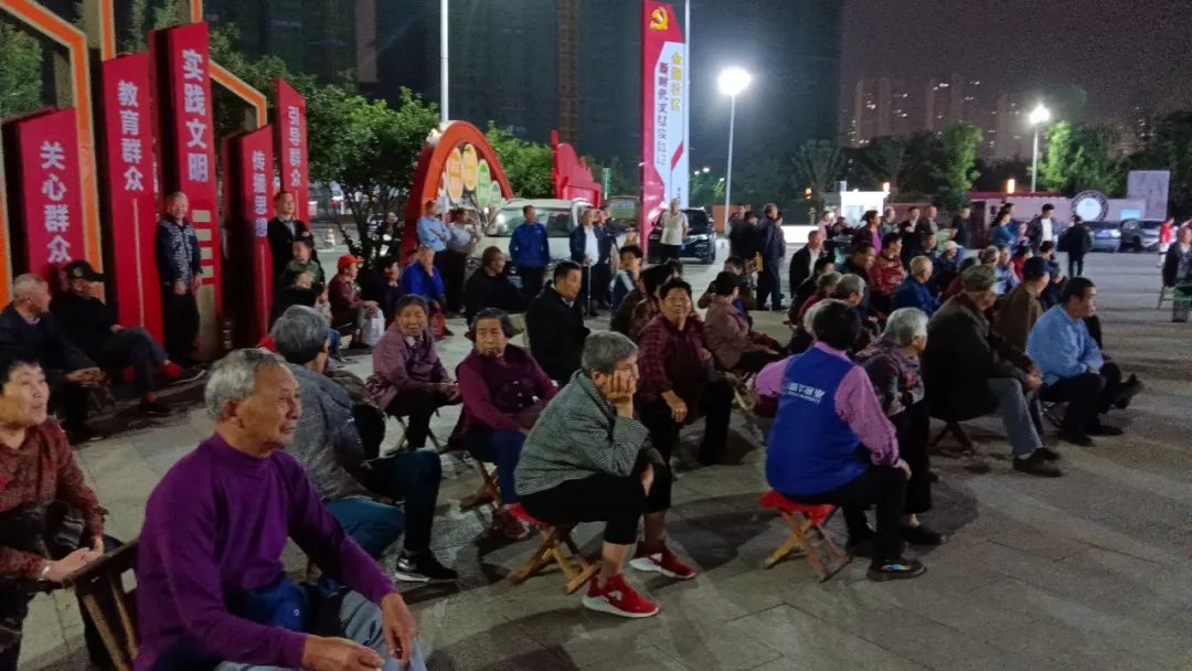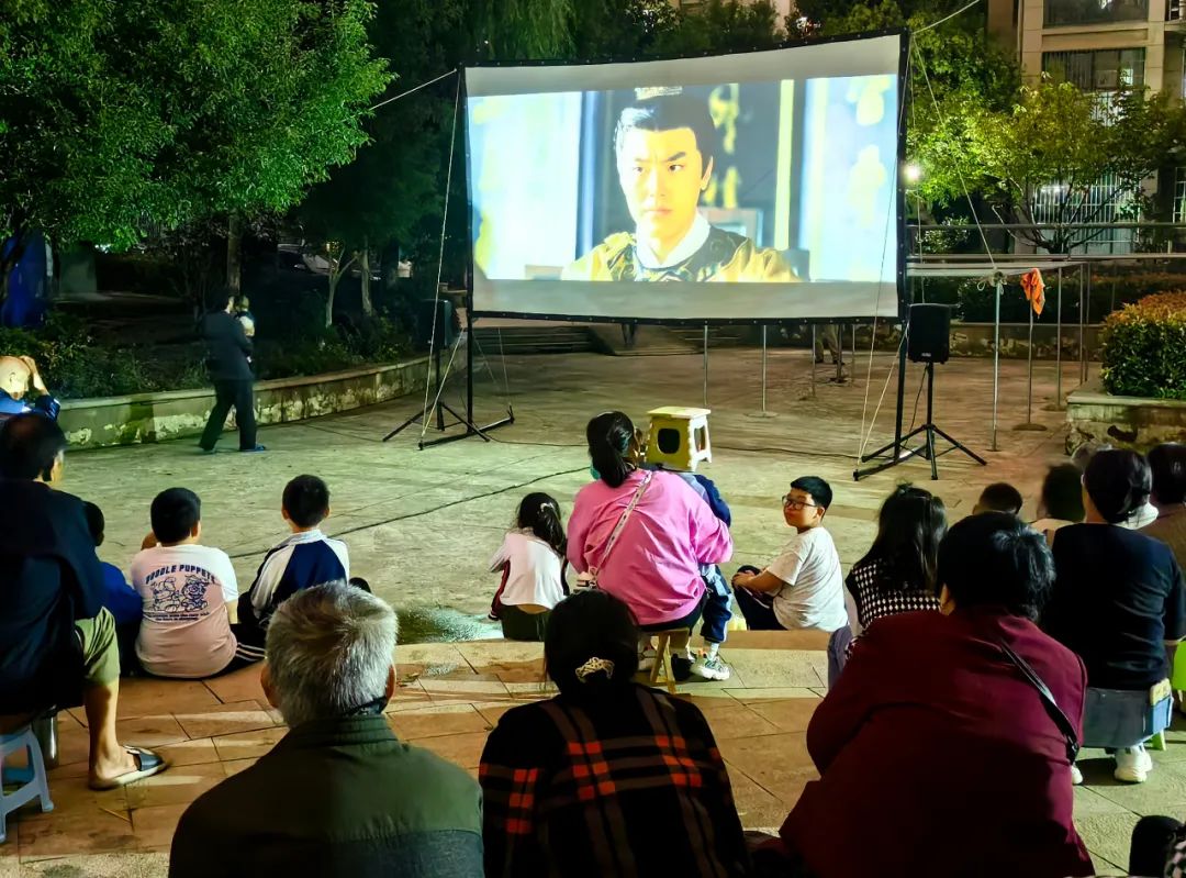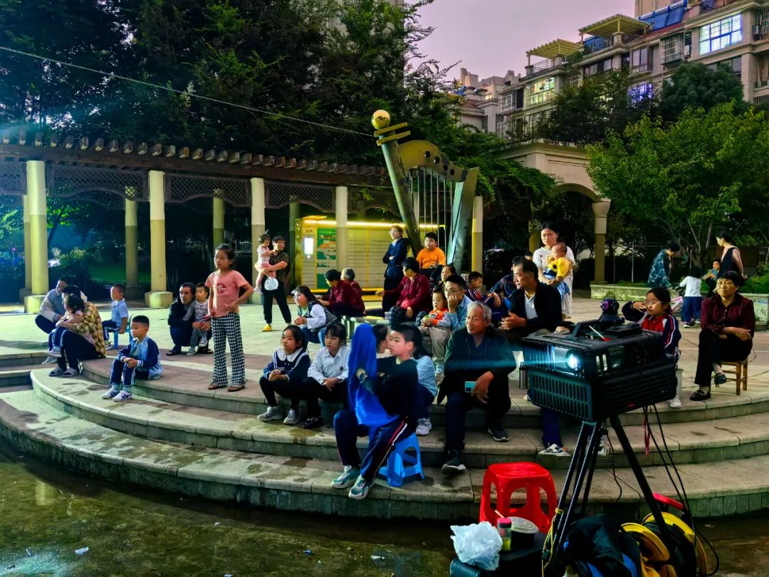 放映现场,电影还没有开演,群众已经相约着聚到广场上,三五成群地围坐在一起,边唠着家常,边等待电影上映。随着银幕的点亮,群众马上安静下来,聚精会神地观看电影。