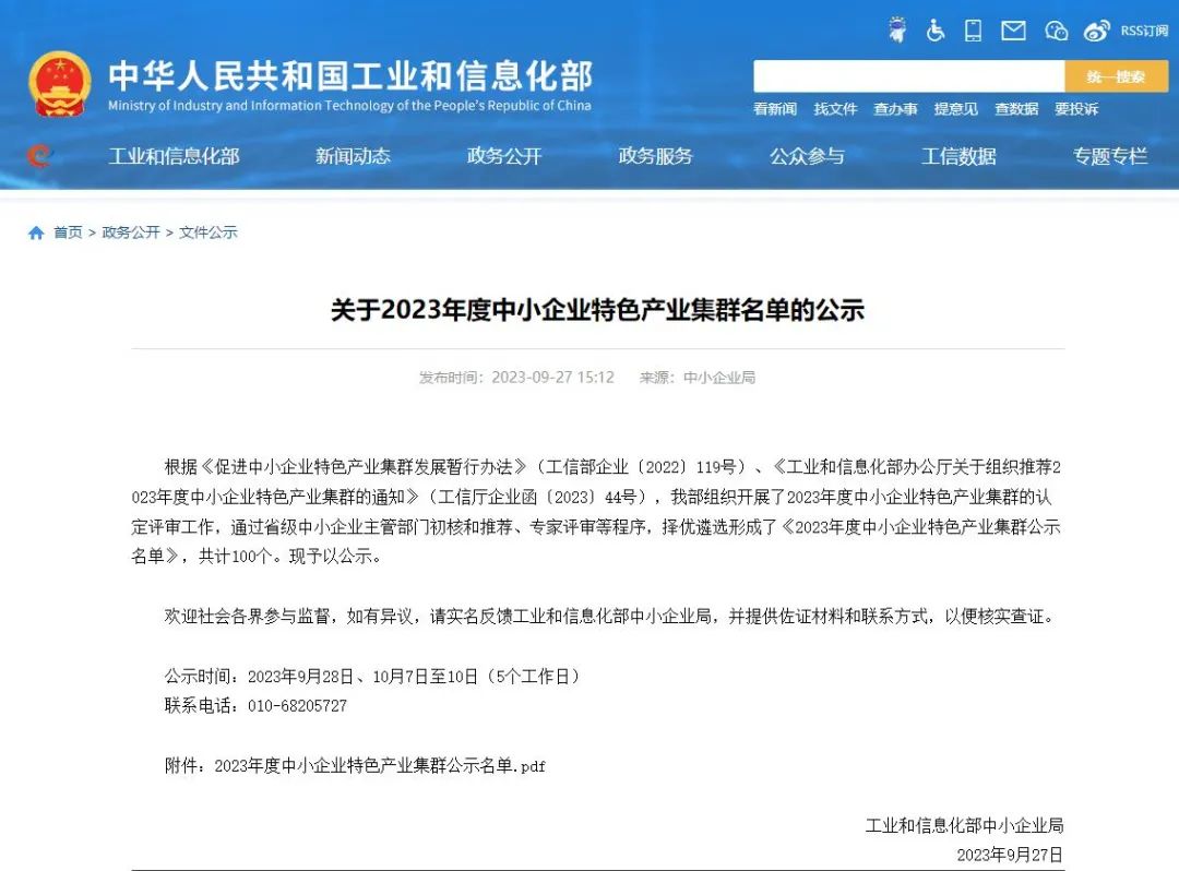 9月27日,工业和信息化部发布《关于2023年度中小企业特色产业集群名单的公示》。根据《促进中小企业特色产业集群发展暂行办法》(工信部企业〔2022〕119号)、《工业和信息化部办公厅关于组织推荐2023年度中小企业特色产业集群的通知》(工信厅企业函〔2023〕44号),我部组织开展了2023年度中小企业特色产业集群的认定评审工作,通过省级中小企业主管部门初核和推荐、专家评审等程序,择优遴选形成了《2023年度中小企业特色产业集群公示名单》,共计100个。现予以公示。公示时间:2023年9月28日、10月7日至10日(5个工作日)。