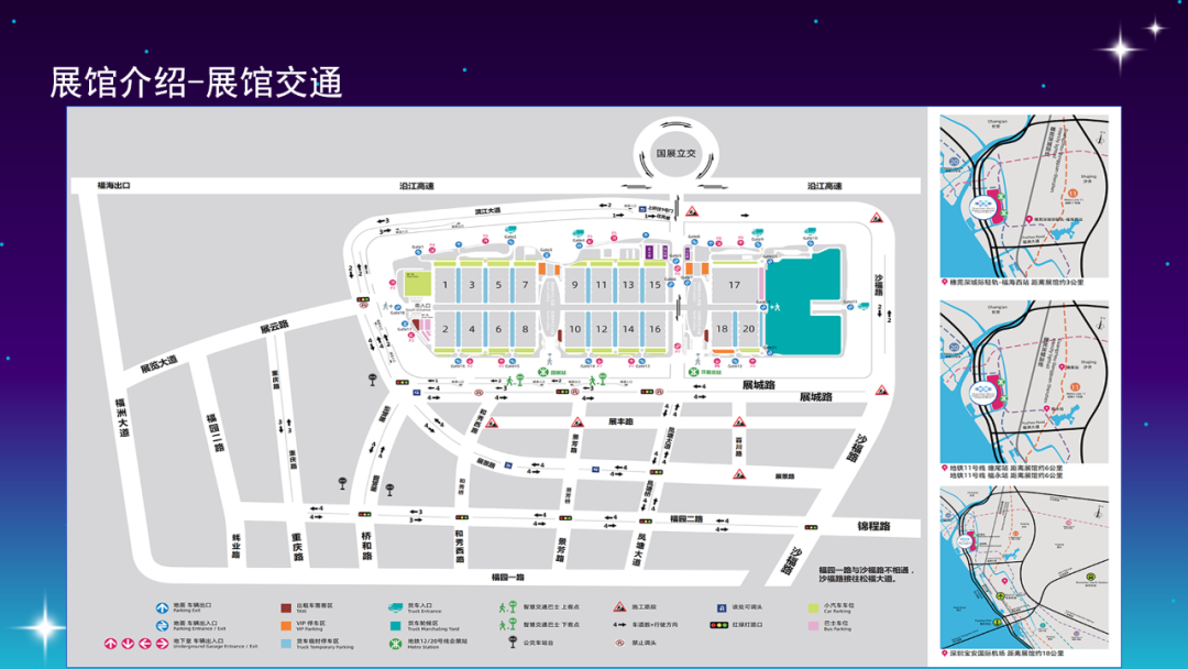 航空:深圳国际会展中心距深圳机场T3航站楼7公里,您可选择搭乘出租车或机场接驳线直达展馆。