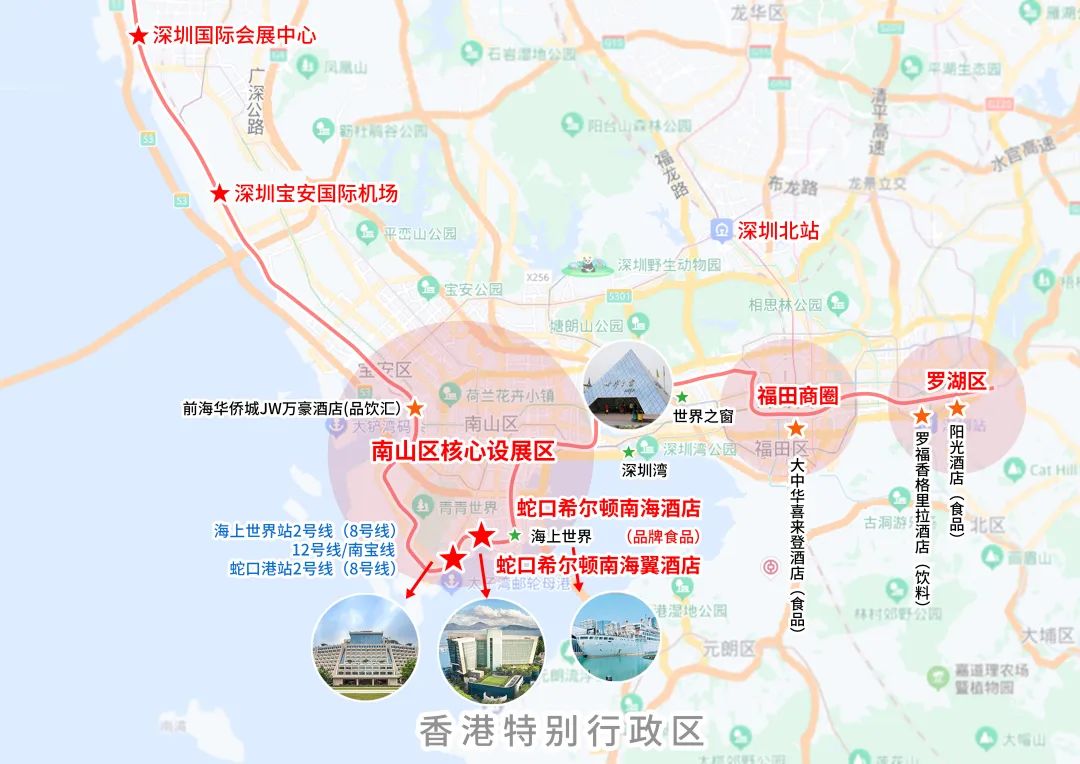 ①希尔顿南海酒店(海上世界站):当你从希尔顿南海酒店,可搭乘地铁12号线(海上田园东方向)到“南山”站,转乘11号线(碧头方向)到“机场北”站,转乘20号线。由国展北站C1、C2出口,您即可直达深圳国际会展中心北登录大厅;由国展站C1、C2出口,您即可直达深圳国际会展中心南登录大厅;②深圳北站:当您抵达深圳北站,可搭乘地铁5号线(赤湾方向)到“前海湾”站,转乘11号线(碧头方向)到“机场北”站,转乘20号线。20号线由国展站C1、C2出口,您即可直达深圳国际会展中心南登录大厅;由国展北站C1、C2出口,您即可直达深圳国际会展中心北登录大厅。③福田站:当您抵达福田站,可搭乘地铁11号线(碧头方向)到“机场北”站,转乘20号线。20号线由国展站C1、C2出口,您即可直达深圳国际会展中心南登录大厅;由国展北站C1、C2出口,您即可直达深圳国际会展中心北登录大厅。④深圳站(罗湖火车站):当您抵达深圳站,可搭乘地铁1号线(机场东方向)到“车公庙”站,换乘11号线(碧头方向)到“机场北”站,转乘20号线。20号线由国展站C1、C2出口,您即可直达深圳国际会展中心南登录大厅;由国展北站C1、C2出口,您即可直达深圳国际会展中心北登录大厅。⑤深圳东站:当您抵达深圳东站,可搭乘地铁5号线(赤湾方向)到“前海湾”站, 换乘11号线(碧头方向)到“机场北”站,转乘20号线。20号线由国展站C1、C2出口,您即可直达深圳国际会展中心南登录大厅;由国展北站C1、C2出口,您即可直达深圳国际会展中心北登录大厅。