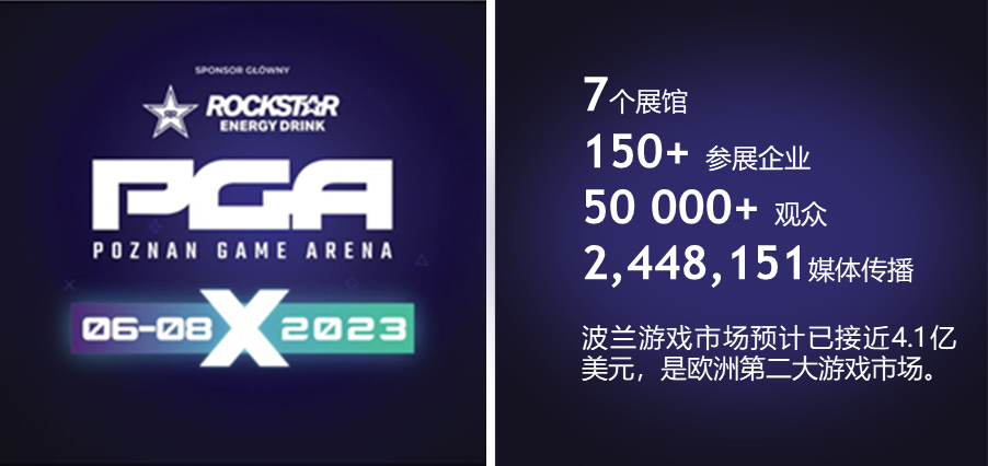波兰(波兹南)游戏展Poznan Game Arena (PGA),是波兰以及中欧、东欧地区最大的计算机、游戏机和多媒体展览会。PGA已有近20年的举办历史,与60万波兰及境外游戏迷共同搭建。PGA于2023年10月6日-8日在波兰波兹南召开。
