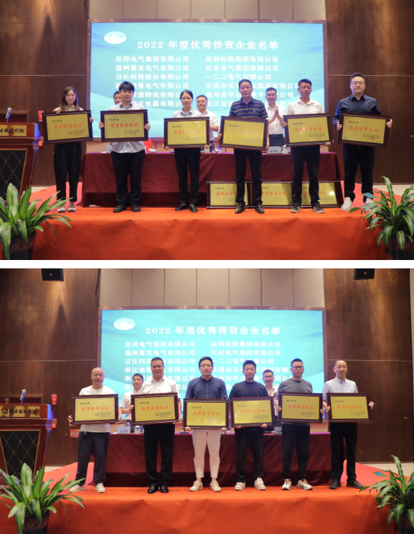 会上表彰了巨邦电气集团有限公司、佑利控股集团有限公司、红光电气集团有限公司、日乐科技股份有限公司、一二三电气有限公司、浙江益而益智能科技有限公司、浙江迪曼电气有限公司、浙江四通物流有限公司、温州龙华日用电子有限公司、温州宏正电器有限公司、温州赛发电气有限公司、乐清市天马国际旅游有限公司共12家“2022年度优秀侨资企业”。