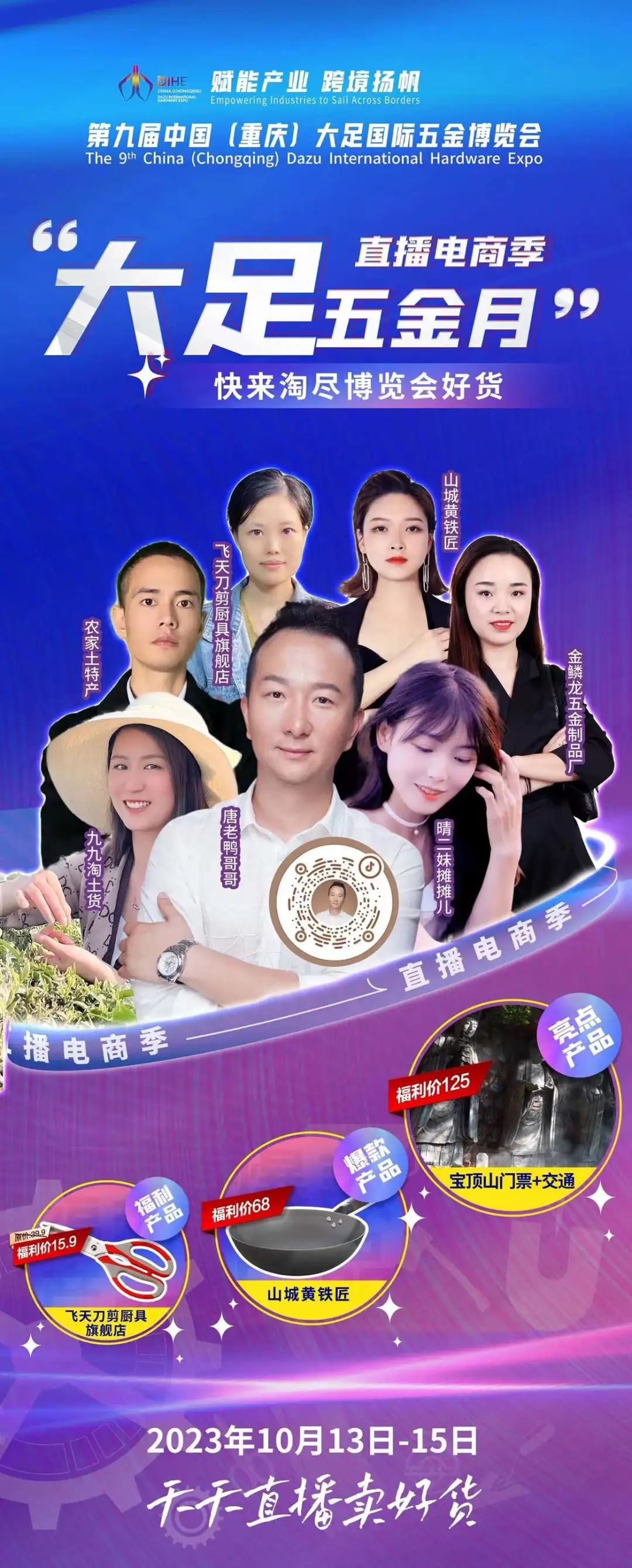 同时,10月13日-15日,市民朋友还可以在抖音、微信视频号、阿里巴巴1688等多电商平台,搜索“邓家刀”、“飞天刀剪厨具旗舰店”、“山城铁匠”、“九九淘土货”、“山城黄铁匠”等10家大足知名五金企业的直播间,淘尽自己心仪的五金产品哦!