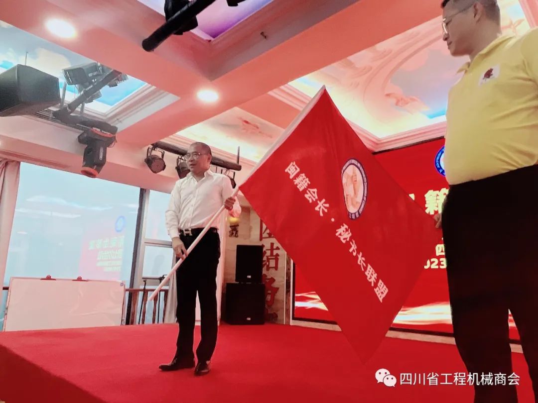 会议的最后,四川省工程机械商会会长杨灿彬与下月轮值的成都泉州商会会长吴晓东,进行了成都闽籍商会联盟第三届第八次会议会旗交接仪式。吴会长表示将结合平台提供的发展契机,为商会会员提供更多渠道的服务,让会员得到更多的跨行信息和服务,真正地实现资源整合、抱团取暖。