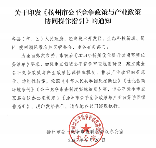 为认真贯彻落实党中央、国务院关于加快建设全国统一大市场、畅通经济大循环的重大决策部署,建立健全公平竞争政策与产业政策的协调保障机制,推动产业政策向普惠化和功能性转变,在充分调研、广泛听取意见的基础上,扬州市公平竞争审查联席会议办公室日前出台了《扬州市公平竞争政策与产业政策协同操作指引》(以下简称《指引》)。