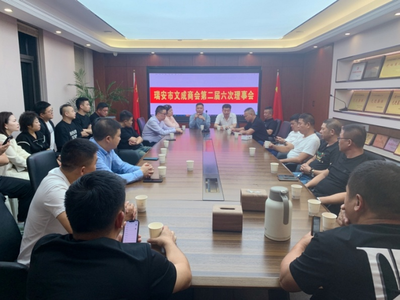 10月8日,瑞安市文成商会召开第二届六次理事会,会长郑书周,执行会长叶增浴,常务副会长、秘书长郑书虎、陈丕锁、王锦右,副会长、副秘书长、理事等30人参加会议。本次会议由会长郑书周主持。