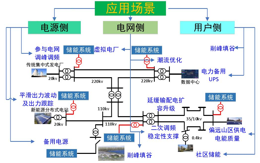 通过部署分布式储能、能源管理终端等设备,实现对电网侧、电源侧、用户侧的电网调峰、调频、新能源调度管理。