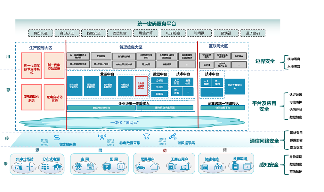 基于国密算法覆盖国网各场景安全防护的统一密码服务平台:提供国网各业务边界的安全防护能力、各系统平台的应用安全防护能力、支持通信加密的网络安全能力以及边端设备的安全接入能力。