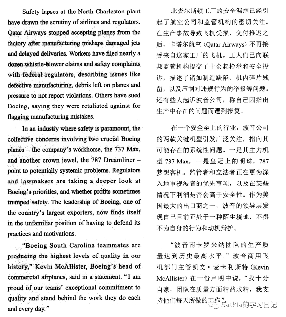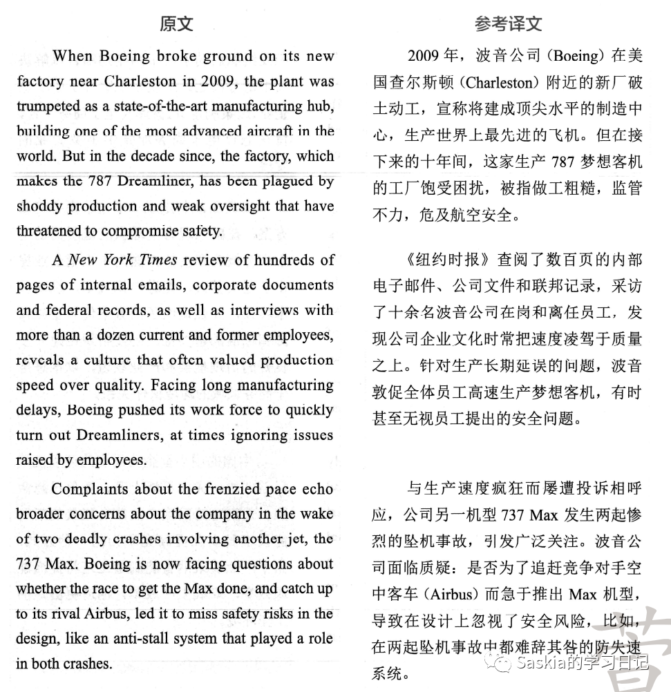 ①《纽约时报》对上百页内部邮件、公司文件、政府记录和与十多位现任或离职员工的采访进行评论,②称该公司常常以生产速度为上,安全为下。面对长期生产滞后,波音公司努力快速制造“梦幻客机”,有时同时却忽略了员工提出的安全问题。(①理解偏差②漏译,企业文化)