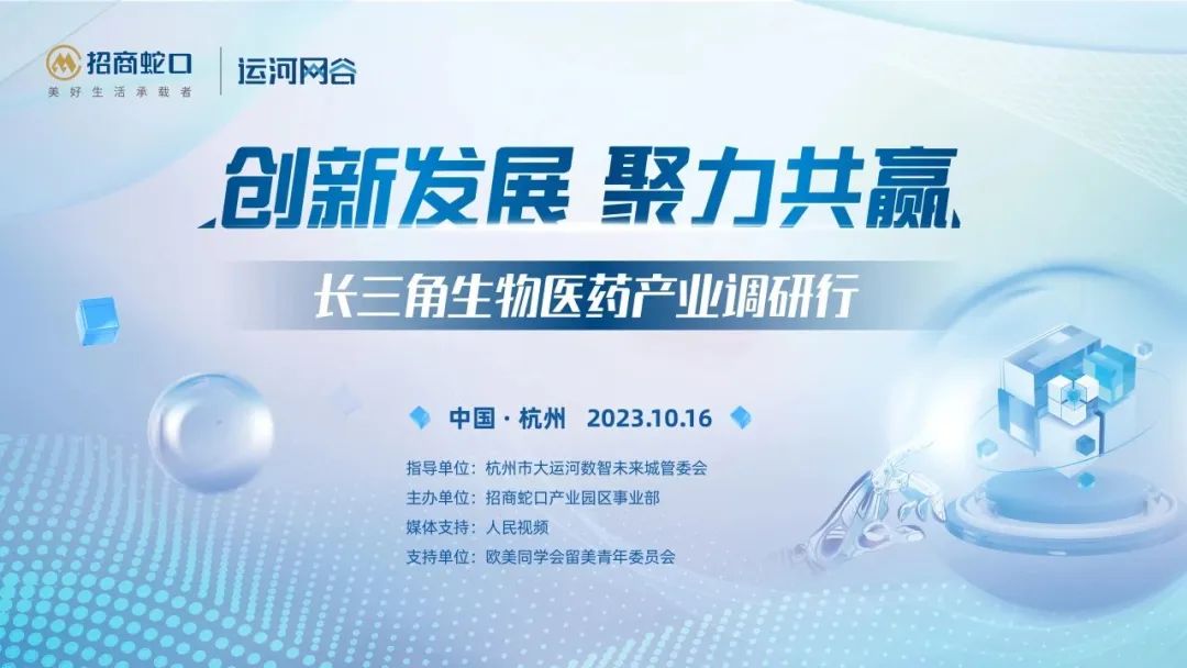 10月16日,由杭州大运河数智未来城管委会指导,招商蛇口产业园区事业部主办,人民视频作为媒体支持的“长三角生物医药产业调研行”将走进杭州运河网谷,以“创新发展,聚力共赢”为主题,邀请生物医药产业企业代表、专家学者和行业精英,与杭州市相关领导共同聚焦长三角区域生物医药产业,推动相关产业高质量发展。