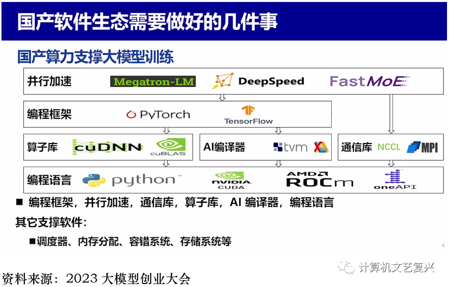 海外英伟达GPU算力卡一卡难求而且价格昂贵,但是国产卡生态依然存在问题。国产算力要支持大模型训练要把生态做好:第一,就是做好编程框架,利用基本算子快速构建人工智能模型,以降低编写人工智能模型的复杂度。例如:PyTorch,TensorFlow。