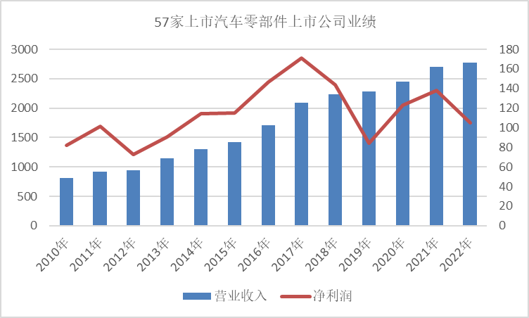 3 防止供应链断裂 “缓兵之计“确有必要作为一个普通消费者,我们坐上电动车和燃油车的经验可能并没有太多违和感,毕竟我们看到的是车的外观,包括车身、车灯、雨刮器、座椅、操作系统一应俱全,但我们看不见的动力系统和传动系统恰恰是汽车零部件的核心。核心零部件往往比汽车整车的集中度更高,比如德国博世、美国德尔福 、日本电装 几乎垄断了所有中国电喷市场份额,其中博世的市场份额一家独大,超过了60%;法士特、采埃孚、伊顿则几乎垄断了全球机械自动变速箱。而一辆汽车中有差不多20000个零部件,一旦汽车终端产品降价,整车厂对零部件的压榨一级一级传递,导致一些起眼或不起眼供应商无利可图。我们都知道汽车产业的魅力在于汽车市场规模庞大,一个最大的特点就是规模经济效应,当规模上升突破了盈亏平衡点,则企业盈利能力几何性上升,反之亦然,如果零部件企业的产能利用率下降到盈亏平衡点以下,市场进一步萎缩企业的亏损面也将成倍扩大。快速增长的新能源汽车可能对那些进不了新能源汽车供应链的零部件企业每况愈下。下面图是57家传统汽车零部件企业的收入和利润变化,上市公司面对传统业务被新能源汽车所侵蚀,可能会拓展一些新的业务,但显然盈利能力在2017年得到高峰后已经进入下行阶段,表现为增收不增利,2022年57家上市公司中有12家业绩亏损。