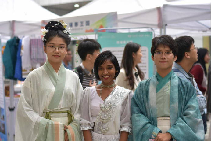 驼铃古道丝绸路,胡马犹闻汉唐风。本次博览会共23个国家展位,来自世界各地的国际学生带来的传统手工艺品和特色服装饰品展示了丰富多样的文化遗产。这些展品包括了传统服装、织物、手绣、饰品、乐器等,不仅展示了各国的独特工艺和传统文化,显示了不同国家和地区的丰富多样的文化魅力,也给中外学生们提供了一个互相交流、了解和学习的机会。缅甸同学弹奏的弯琴琴声清新雅致,娓娓动听,让我们领略了古代乐器的魅力。塞拉利昂同学带来的手工制品精致考究,令人爱不释手,赞叹不已。印度同学们用精心设计的卡片展示了印度语的基本常用语,与中外学生热情互动。俄罗斯同学们带着大家一起做起了精美细腻,色彩丰富的传统刺绣。来自国学社的中国同学向大家展示汉服,介绍传统中华服饰形制及其蕴含的礼仪制度、思想文化等内容。中外同学一起试穿体验不同国家服饰,共玩小游戏,共赏工艺品,获取通关贴纸,领取心仪礼品。