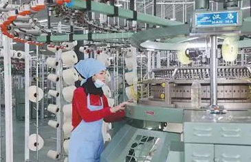 工人在中泰新丝路塔吉克斯坦农业纺织产业园针织车间操作设备