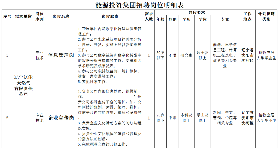 为满足业务发展需要,能源投资集团拟面向社会公开招聘2名专业技术岗工作人员(详见附件1)(见文中最下方)。