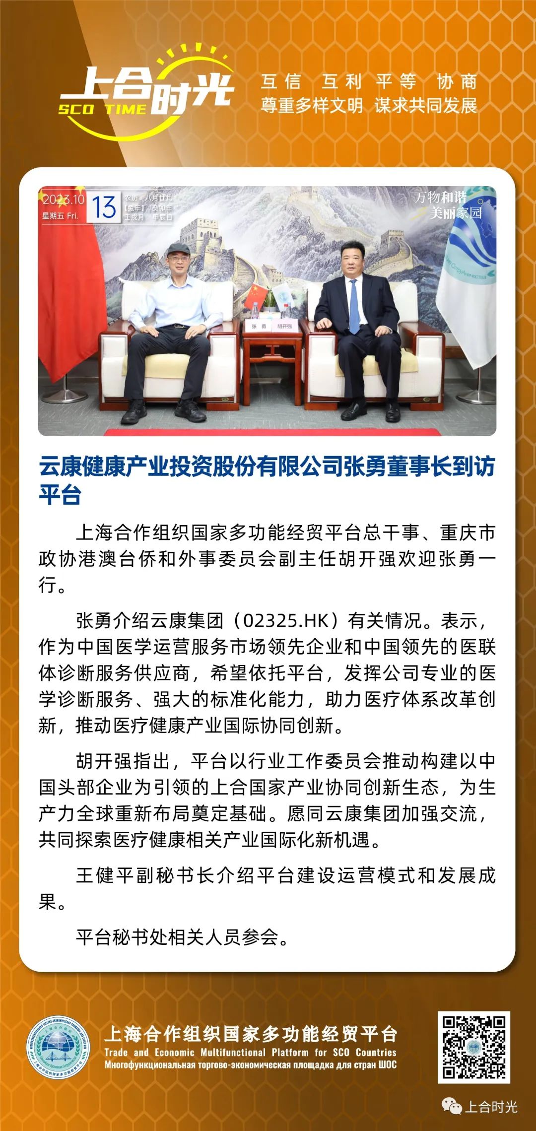 胡开强高度评价云康集团核心技术领域取得的领先成果。指出,平台坚持弘扬“上海精神”,深入践行历次上合组织成员国元首理事会决议,围绕“构建数字经济与传统经济深度融合的上合新生态”核心任务,以行业工作委员会融合多种所有制市场主体推动构建以中国头部企业为引领的上合国家产业协同创新生态,力求打通不同所有制企业之间的合作壁垒,为生产力全球重新布局奠定基础。愿同云康集团加强交流,共同探索医疗健康相关产业国际化新机遇。