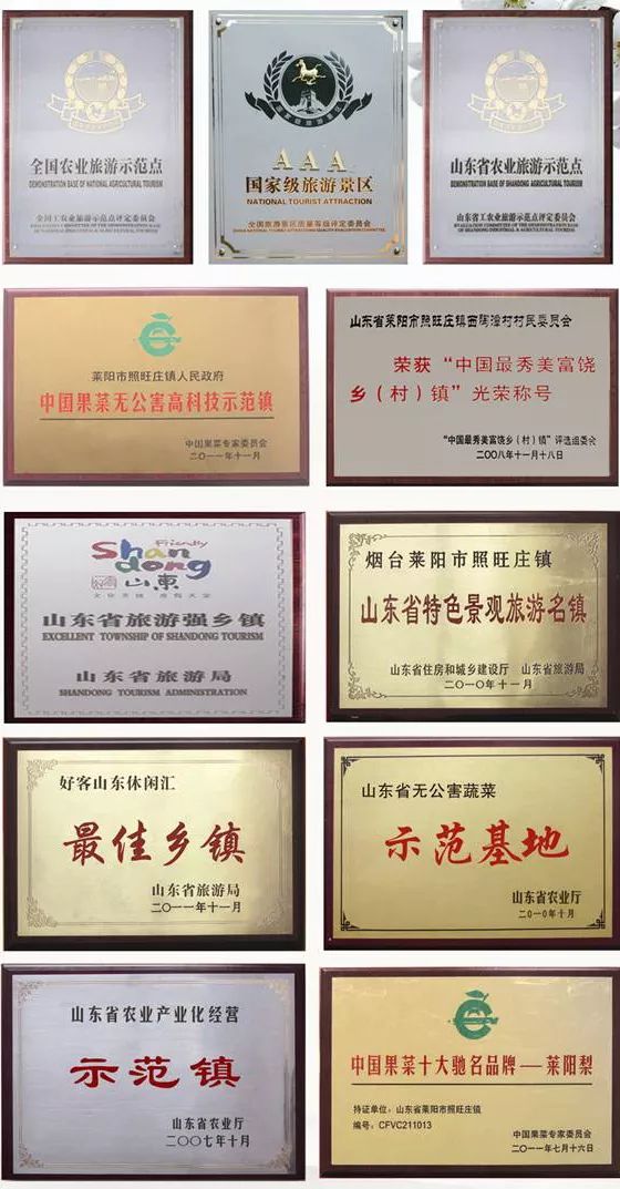 荣获国家级农业旅游示范点、中国果菜无公害高科技示范镇、国家AAA级景区、山东省旅游强乡镇、山东省特色旅游景观名镇和山东省首批 “宜居小镇”、烟台市梨花小镇等多个荣誉称号,景区贡梨园被国家文物局认定为“中国文化遗产”,照旺庄梨花小镇纳入烟台市特色小镇创建名单。