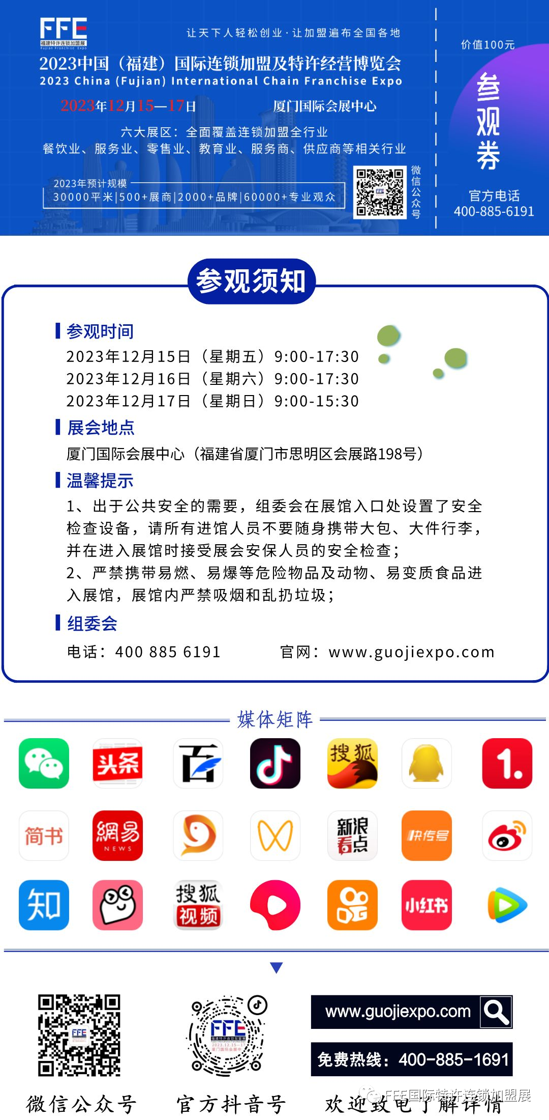 由福建省连锁经营协会和博亚国际展览有限公司联合主办,各省、市连锁经营协会协办,福建华之信国际会展有限公司执行承办的2023中国(福建)国际连锁加盟及特许经营博览会(简称:FFE加盟展)将于2023年12月15-17日在厦门国际会展中心举办。展会以“餐饮、教育、服务、零售、连锁资源”五大行业为主题,围绕连锁品牌招商、品牌正规化加盟、标准化经营,进行深度交流与招商加盟合作。立足厦门,辐射全国,推动品牌渠道下沉,帮扶企业成长; 以新媒体会展+模式,为更多优质加盟商寻找更优质加盟项目,打造东南地区线下招商加盟平台行业标杆。诚邀全国连锁企业及各界创业精英,共襄盛举! 届时邀请政府领导、专家学者、企业精英、协会领导等一道解析行业发展形势,挖掘新动能,探寻新思路,共同打造“创新、合作、发展、共赢”的全球合作平台。