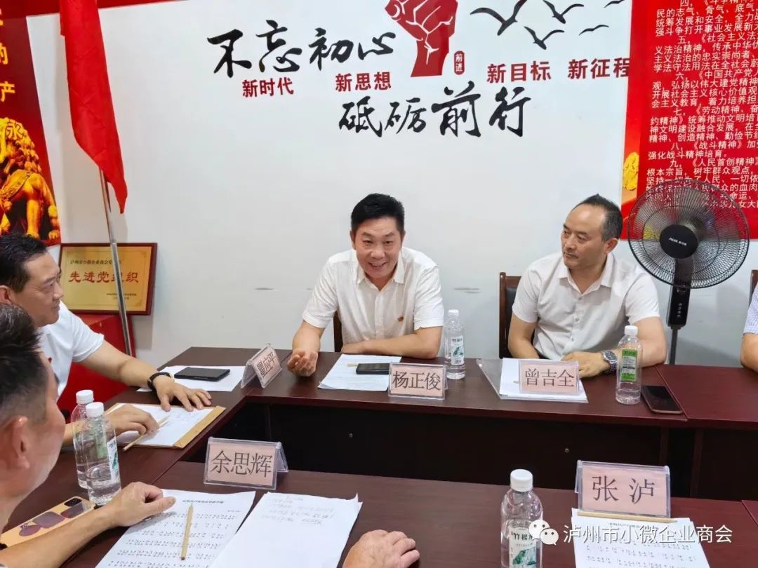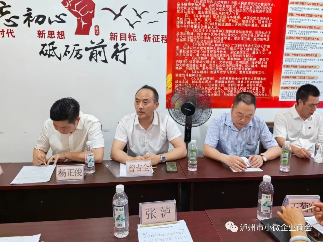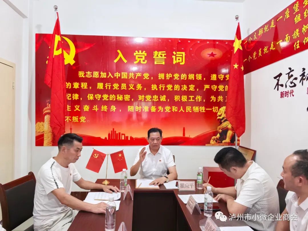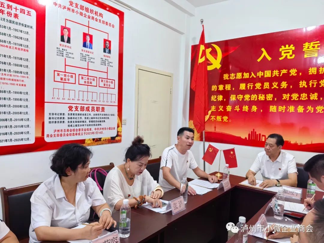 中共泸州市小微企业商会支部委员会于2023年7月14日经泸州市总商会综合党委正式批准同意成立实体型党支部, 2023年9月10日下午, 中共泸州市小微企业商会实体型支部委员会第一届党员大会在美丽的酒城圆满举行。泸州市小微企业商会常务副会长/中共党员瞿应平;副会长/中共党员余思辉、曾吉全;中共党员张泸;名誉会长/中共党员杨正俊、常务副会长/中共党员王菊容、吴成周;副会长/中共党员熊南祥、游虎出席会议;名誉会长白云平、秘书长曾贵洁列席会议;瞿应平主持会议。