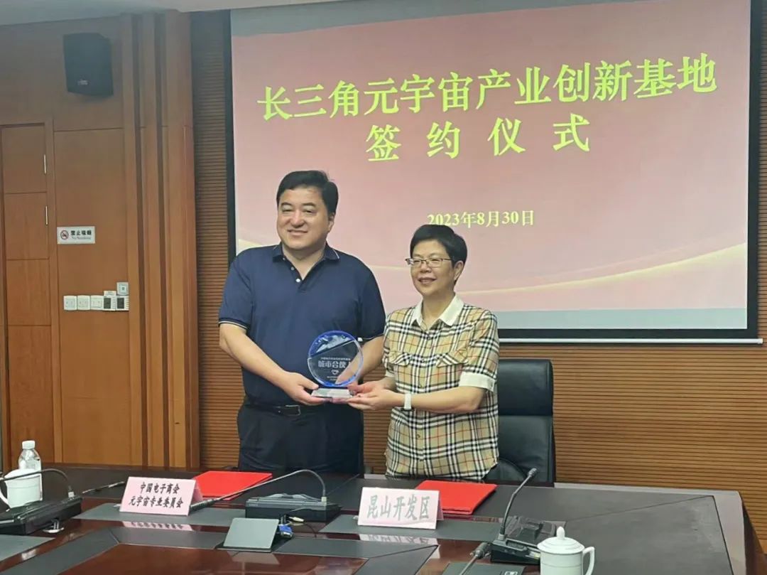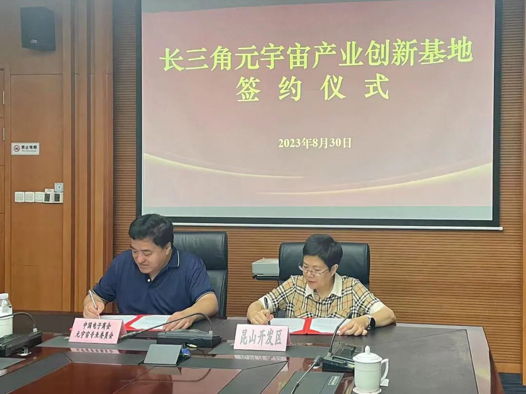 为了更好的推动行动计划落地及元宇宙总部基地建设,中国电子商会元宇宙专委会与昆山开发区达成战略合作,正式签约成为昆山城市合伙人,在昆山开发区云昆大厦打造长三角元宇宙产业创新基地。2023年8月30日,签约仪式在昆山开发区时代大厦正式举行,昆山开发区党工委委员、管委会副主任秦珊珊,昆山开发区科技局局长顾利华及相关领导,中国电子商会元宇宙专委会常务副理事长董宝青、秘书长吴少岩、副秘书长王悦名及基地管理负责人郑栋董事长、赵安虎总经理等多位领导出席了签约仪式。