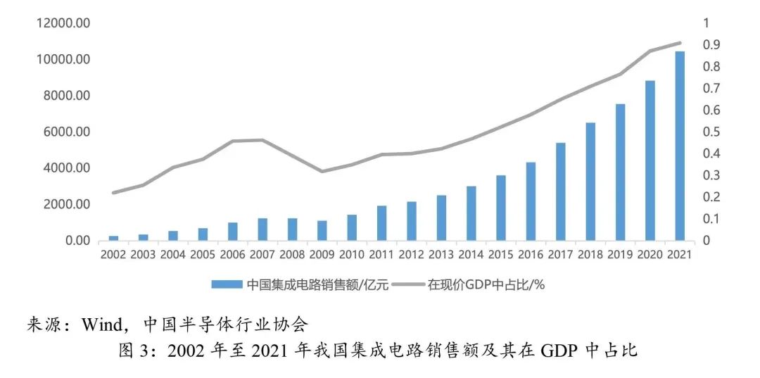 我国半导体产品销售长年位居全球市场份额第一,2022年销售占全球比重约为31.8%。根据中国半导体行业协会数据,2021年我国集成电路销售额1.05万亿元,在GDP中的占比提升至0.91%且继续保持上升趋势。作为对比,美国2021年半导体产业增加值对国内GDP的贡献约为2769亿美元,其中:直接贡献约961亿美元,间接贡献约856亿美元,其他相关贡献约953亿美元,半导体产业贡献GDP占比约为1.19%。考虑到我国统计口径未包含分立器件、光电子器件、传感器等其他半导体器件,实际市场规模和GDP占比应该与美国差距不大。